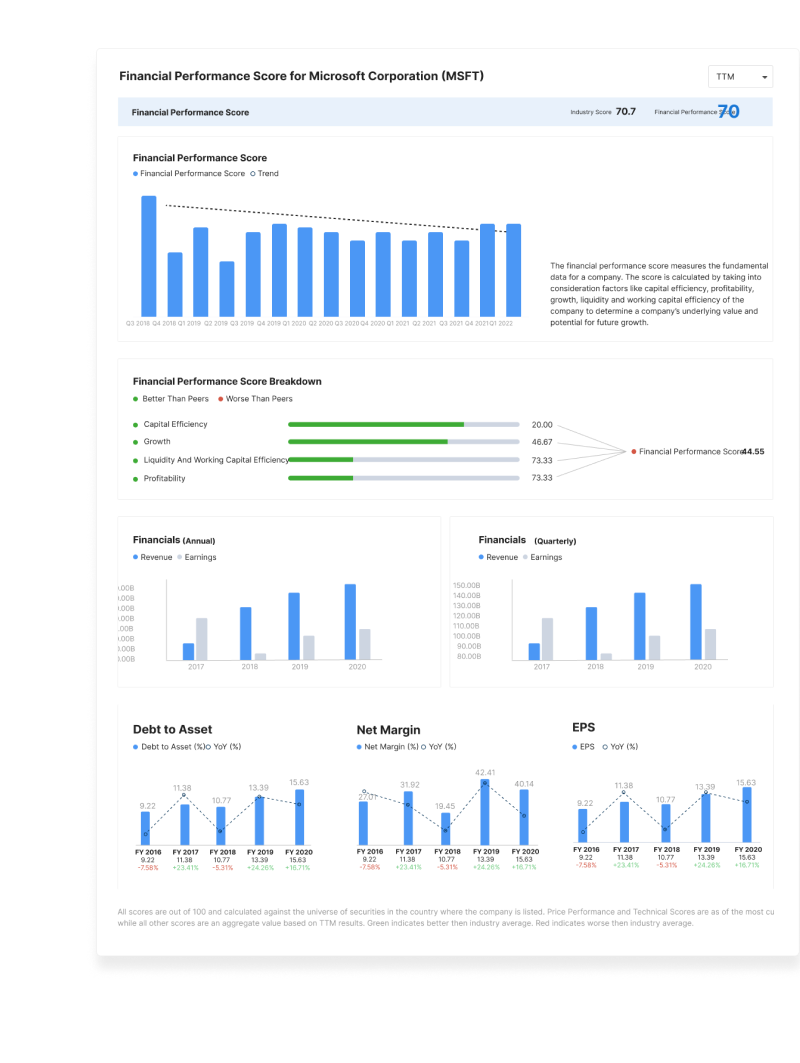 Search for an Equity listed on the exchange of your choice. Choose from several equity research parameters to include or omit and generate a tearsheet in HTML or PDF format.