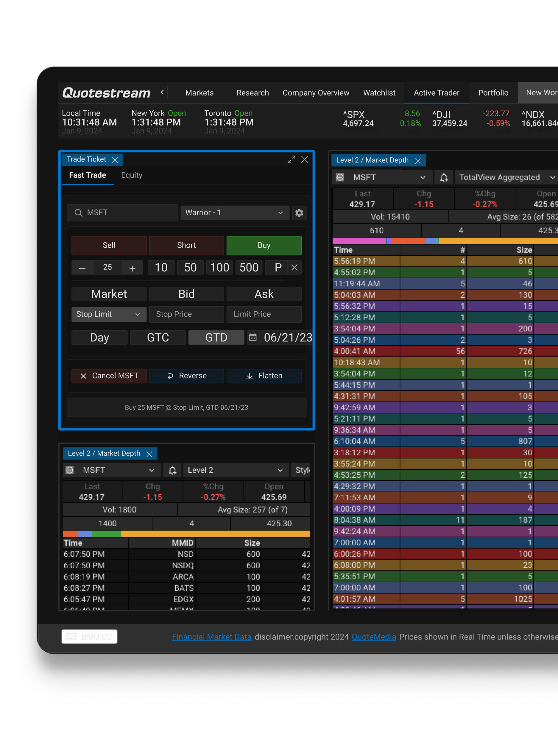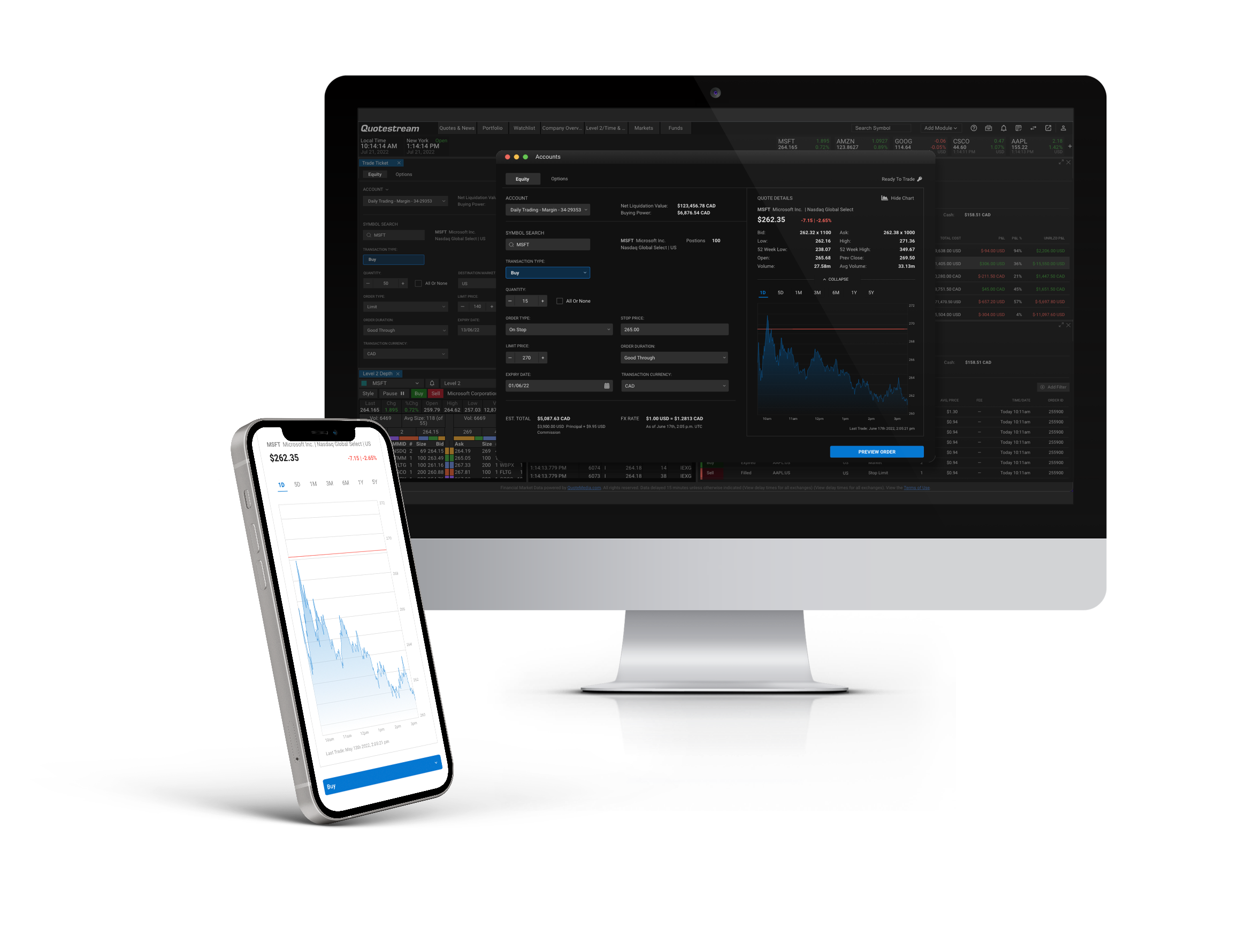 QuoteMedia enables product teams to enhance customer journeys to streamline the integration and display of trade functionality within brokerage web portals, active trader, web and mobile platforms.