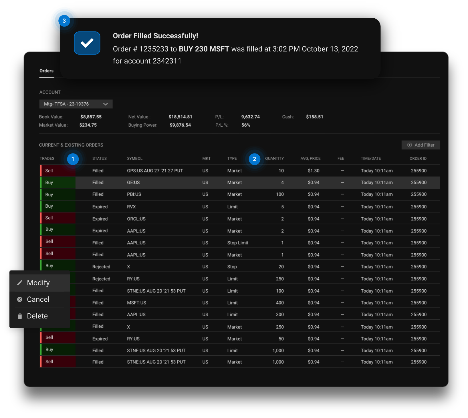 Access order history from one to many accounts. View detailed historical Filled, Expired and Rejected orders.
